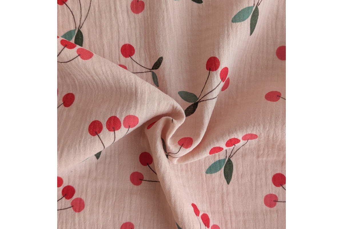 Miękka tkanina bawełniana, muślin, double gauze, wisienki na beżoworóżowym tle.