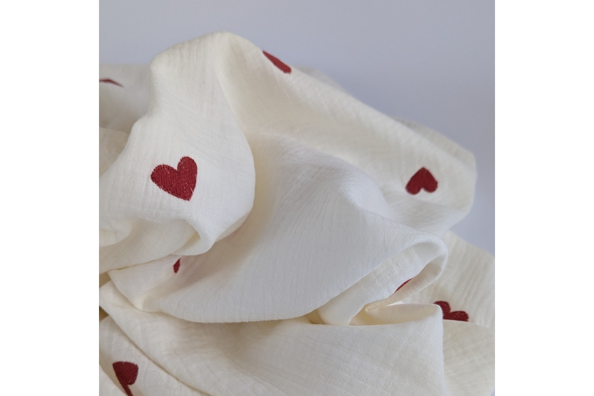 Miękka tkanina bawełniana - dwuwarstwowy muślin drukowany w haftowane, czerwone serduszka na kremowym tle.