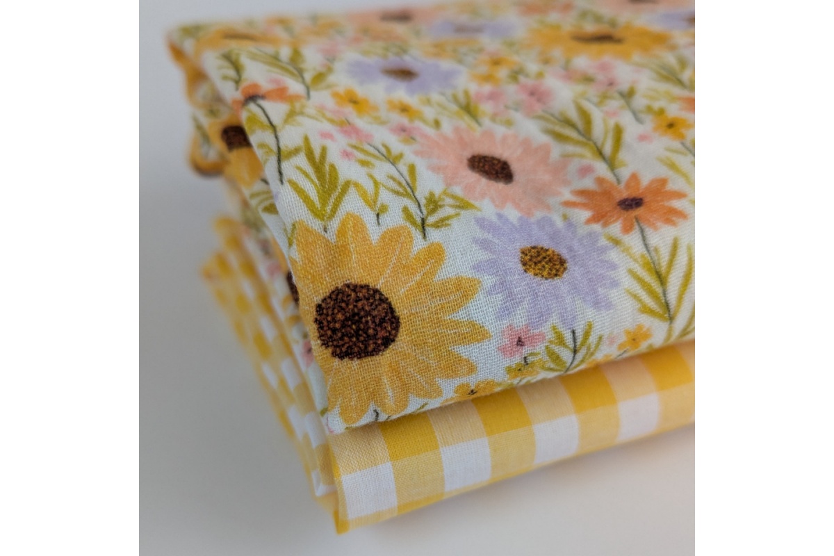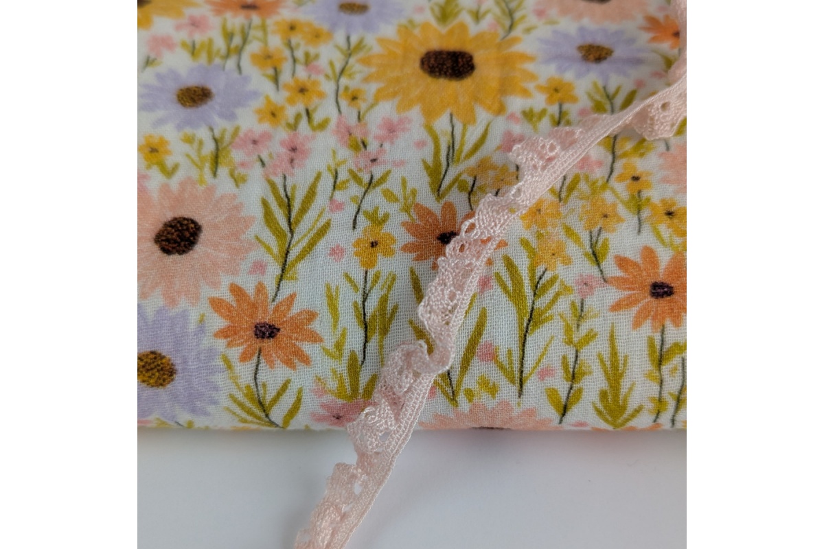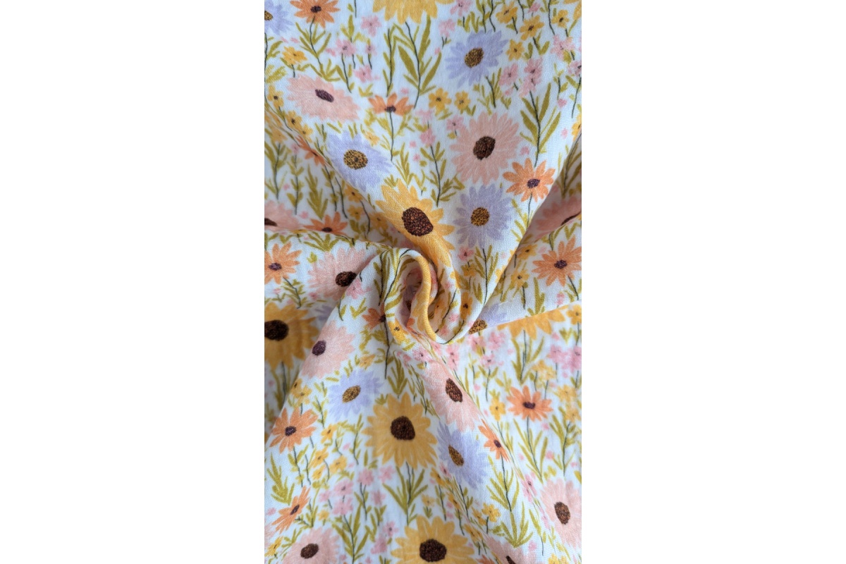 Miękka tkanina bawełniana - muślin dwuwarstwowy drukowany cyfrowo w kolorowe kwiaty na ecru.