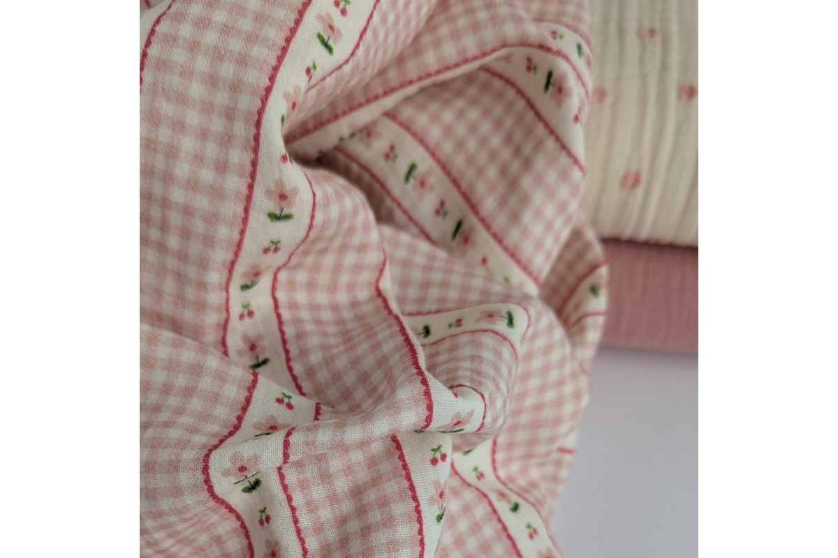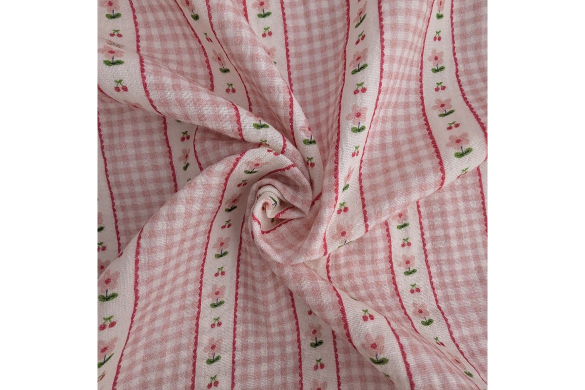 Miękka tkanina bawełniana – dwuwarstwowy muślin drukowany cyfrowo w drobne kwiatki i wisienki na tle różowej krateczki.