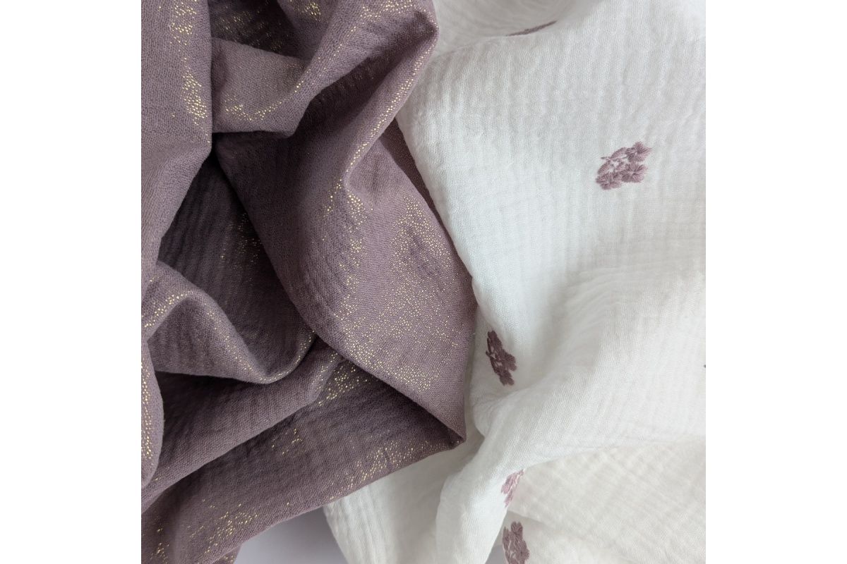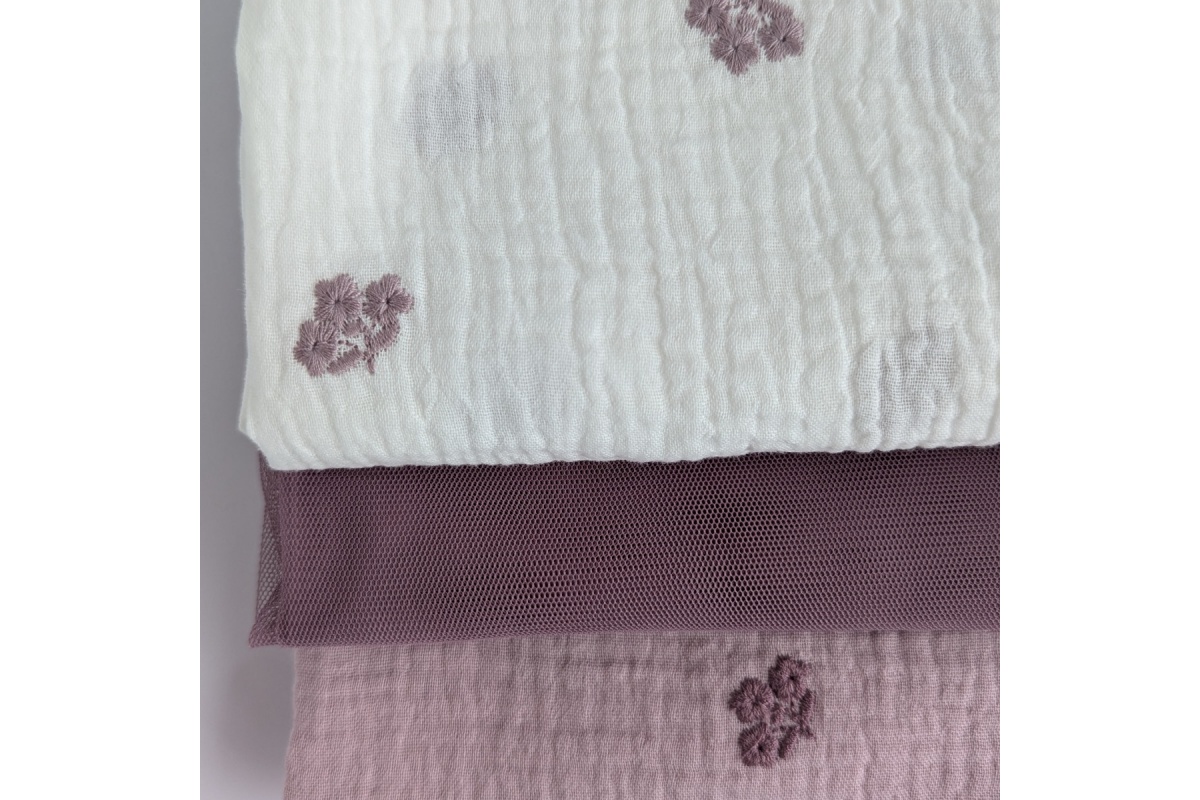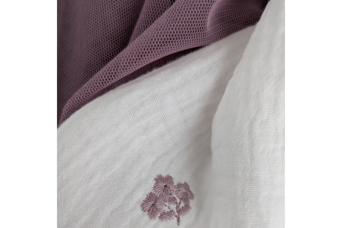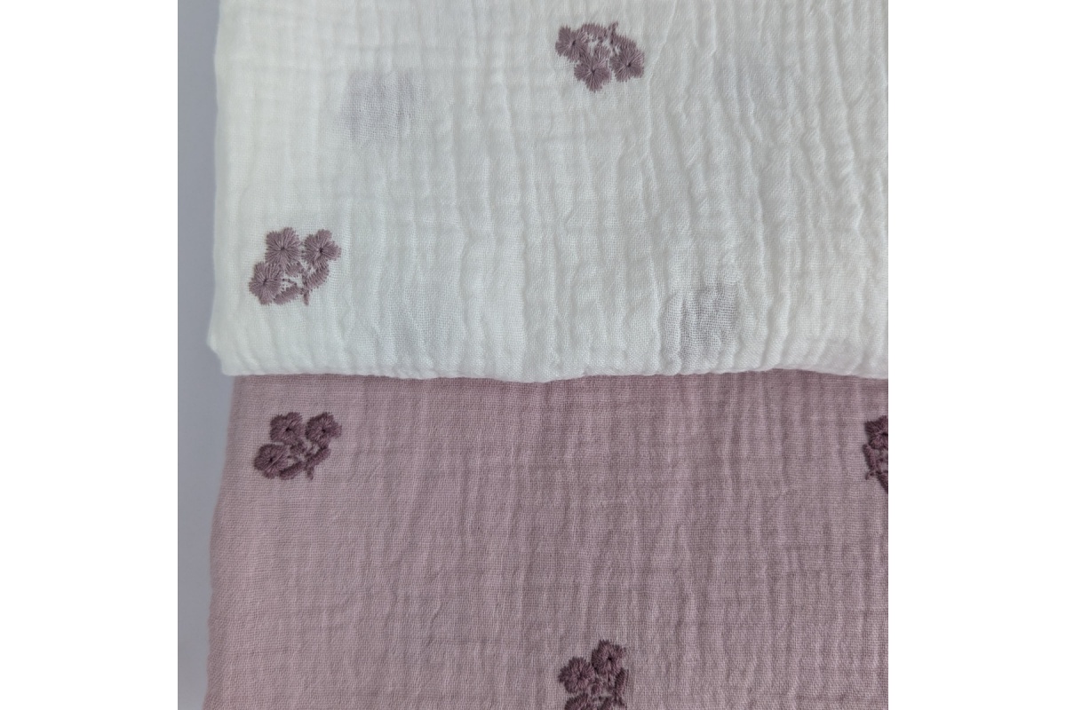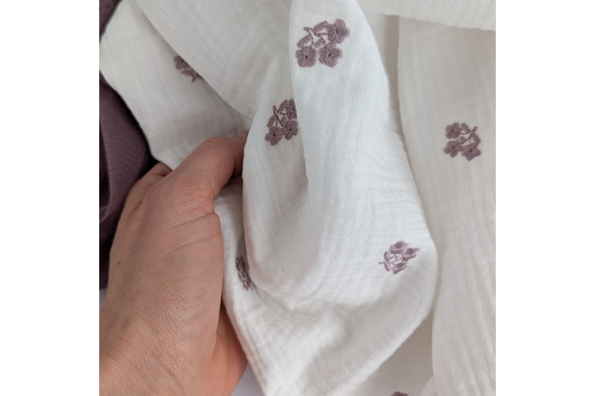 Miękka tkanina bawełniana - dwuwarstwowy muślin drukowany w haftowane, wrzosowe kwiatki na ecru.