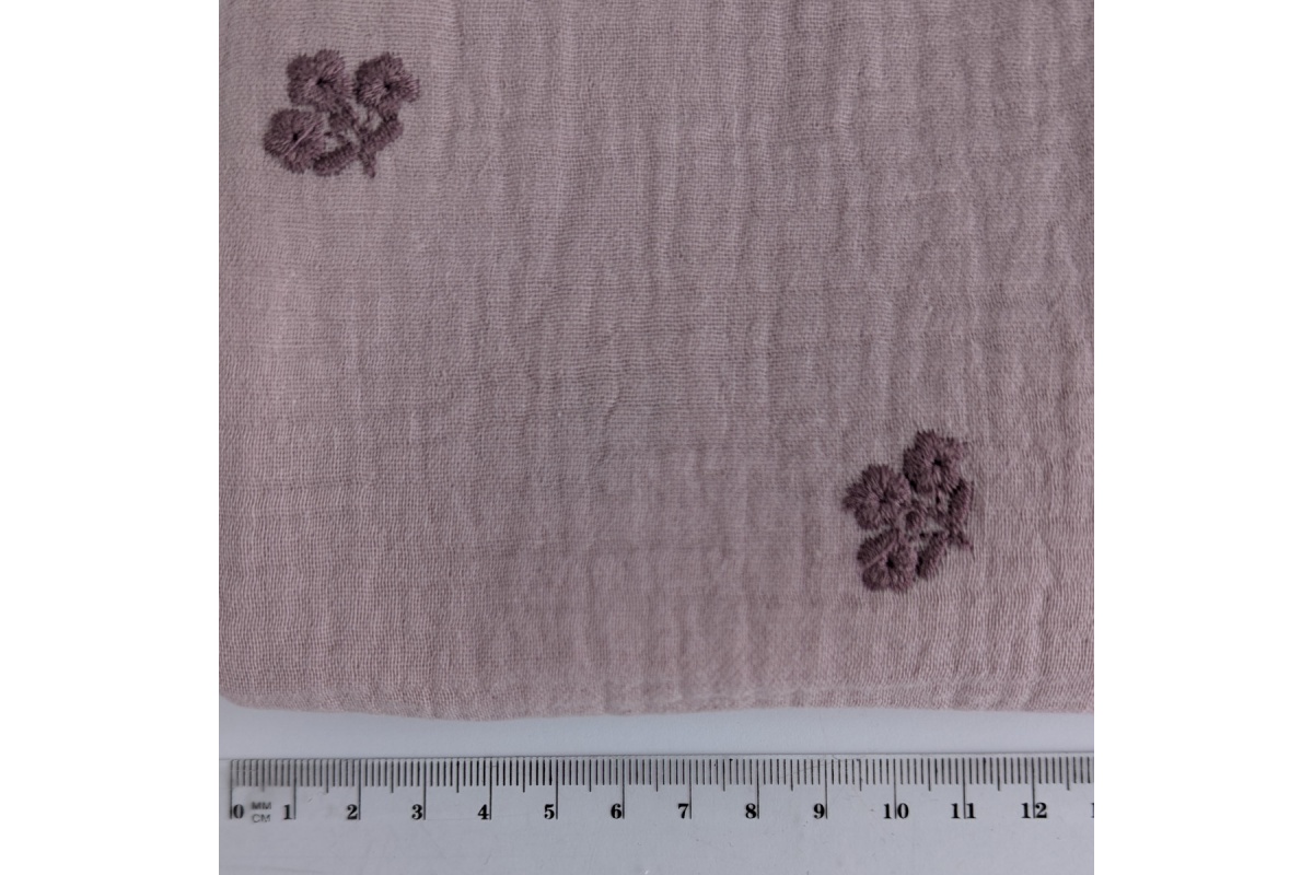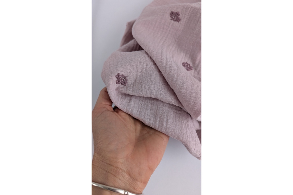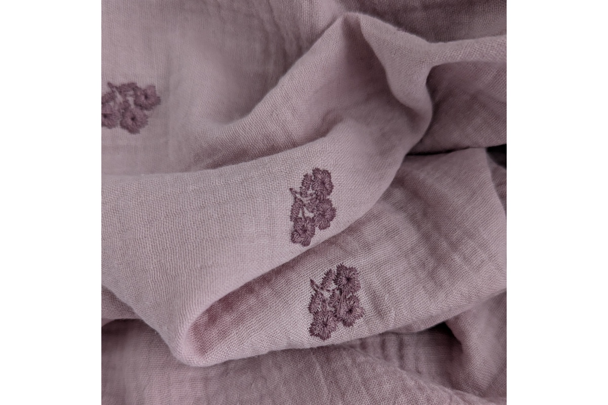 Miękka tkanina bawełniana - dwuwarstwowy muślin drukowany w haftowane, wrzosowe kwiatki na brudnym wrzosie.