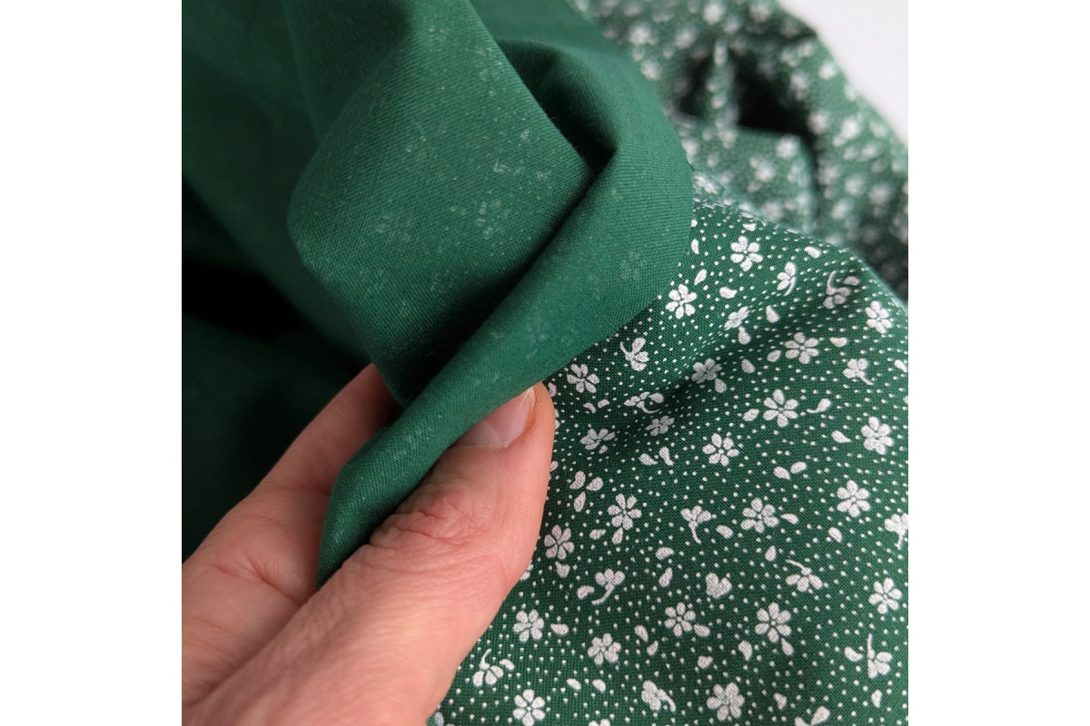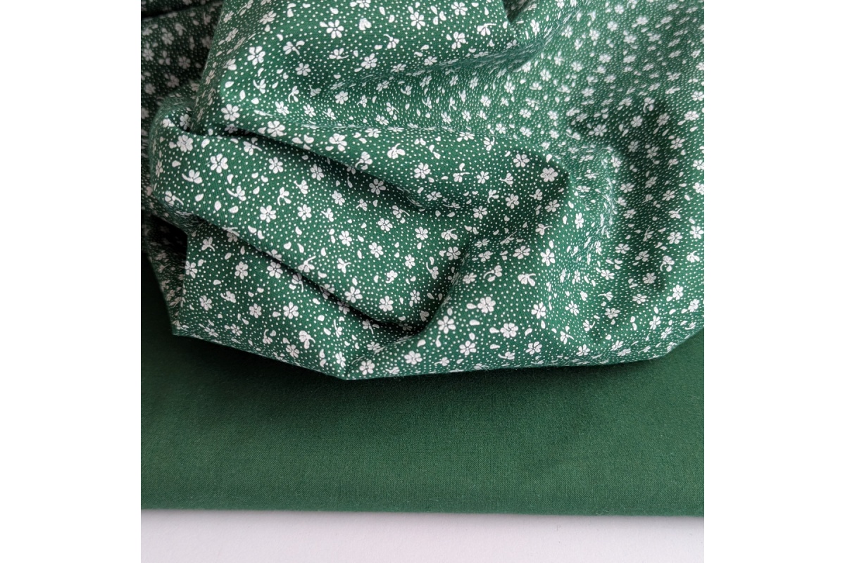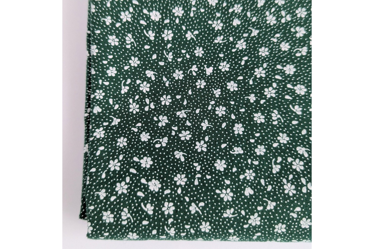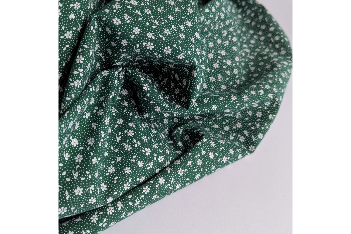 Tkanina bawełniana w białą łączkę, drobne kwiatki na ciemnozielonym tle.
