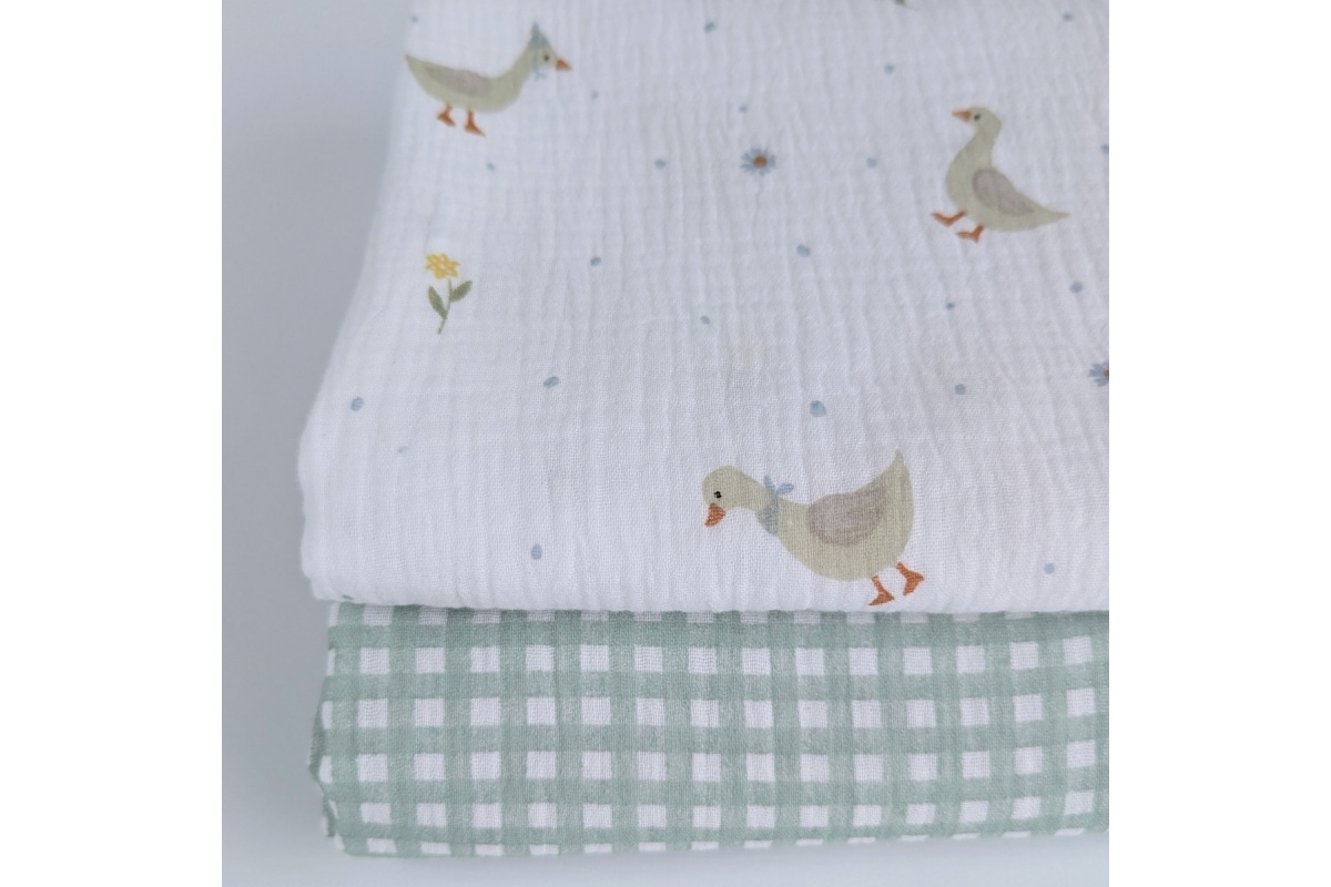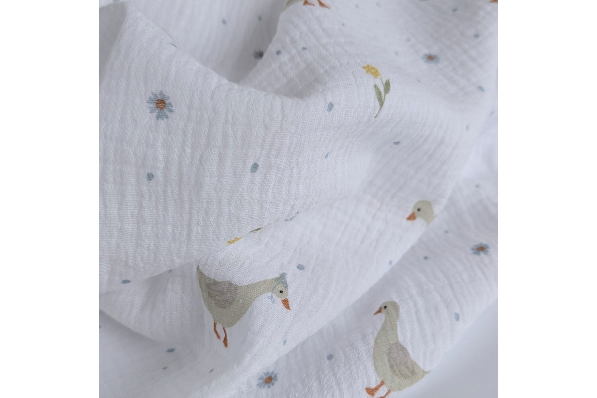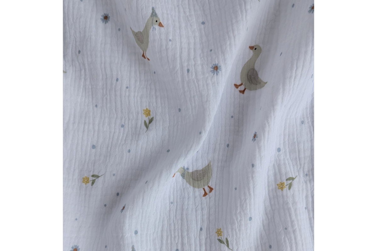 Wysokiej jakości miękka tkanina bawełniana - muślin drukowany w gąski na białym tle.