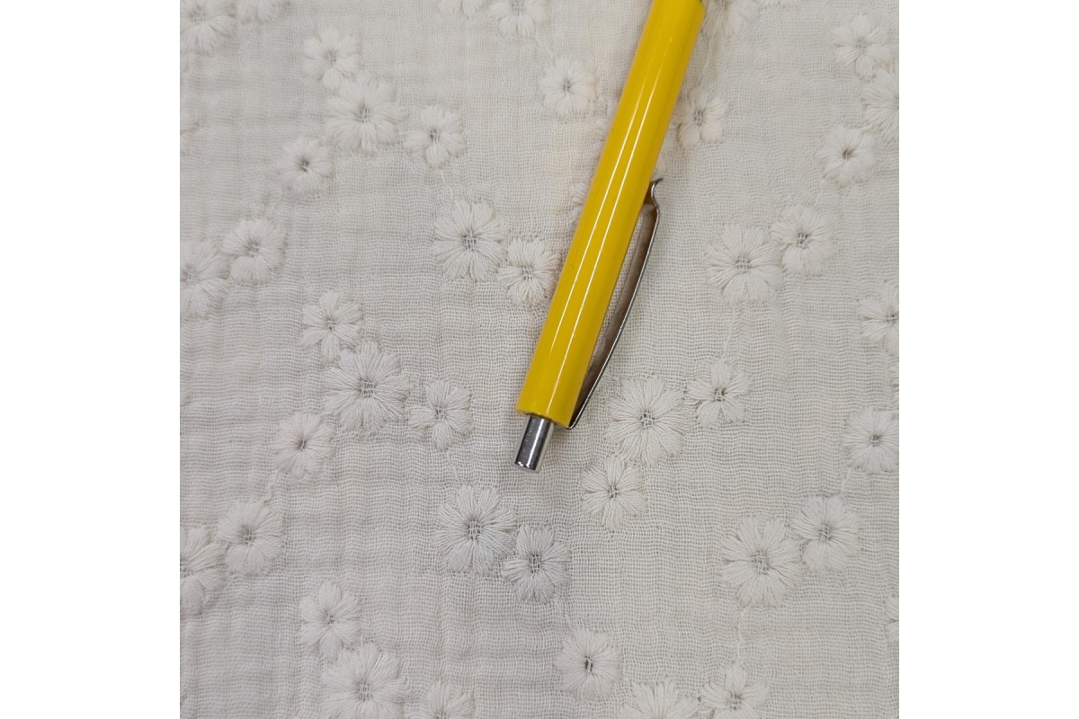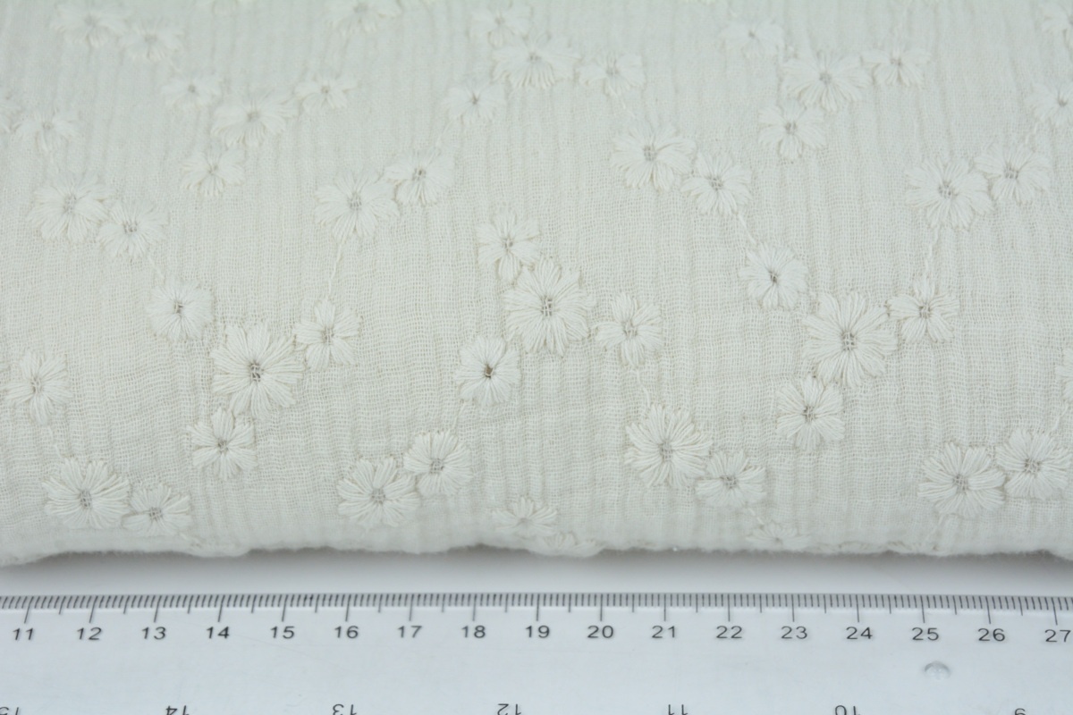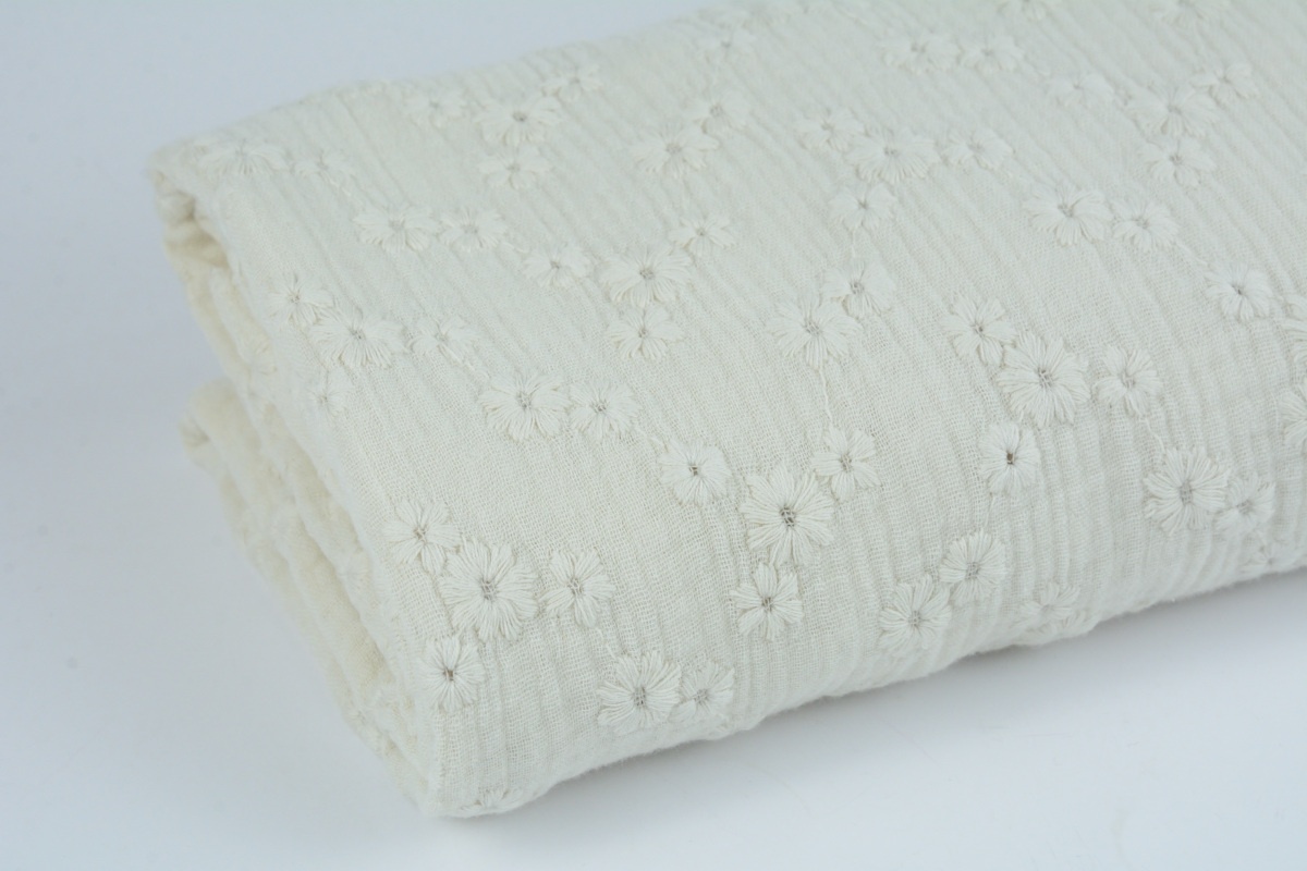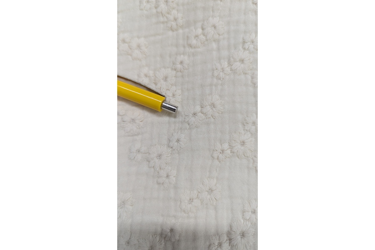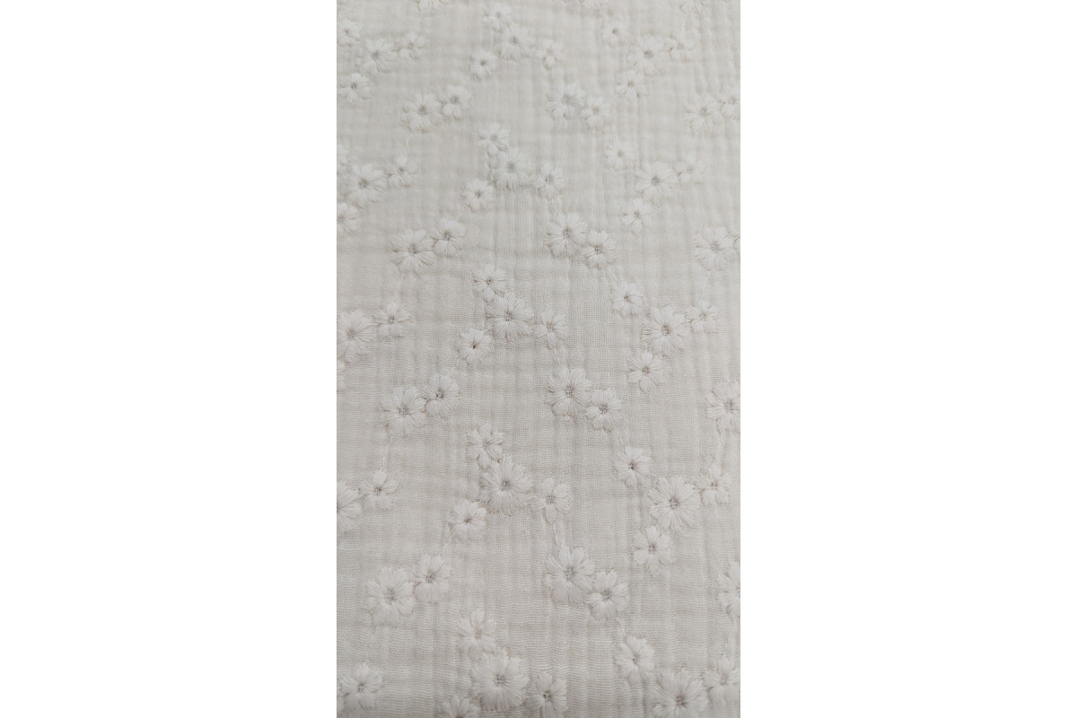 Wysokiej jakości miękka tkanina bawełniana - muślin z haftem kwiatowym w kolorze jasnego beżu.