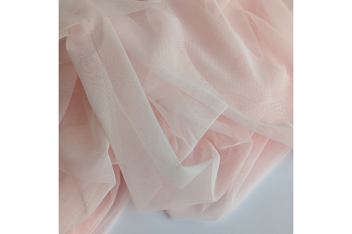 Tiul miękki, drobny w kolorze słodkiego różu. Miękki w chwycie, lejący.