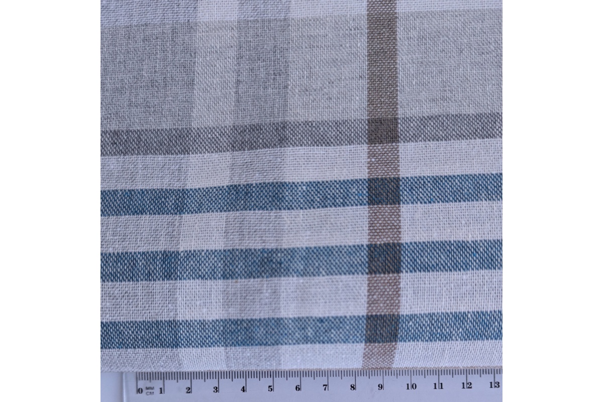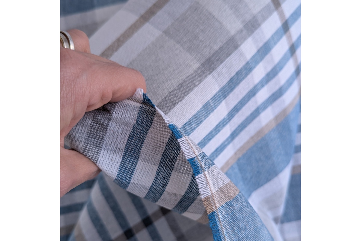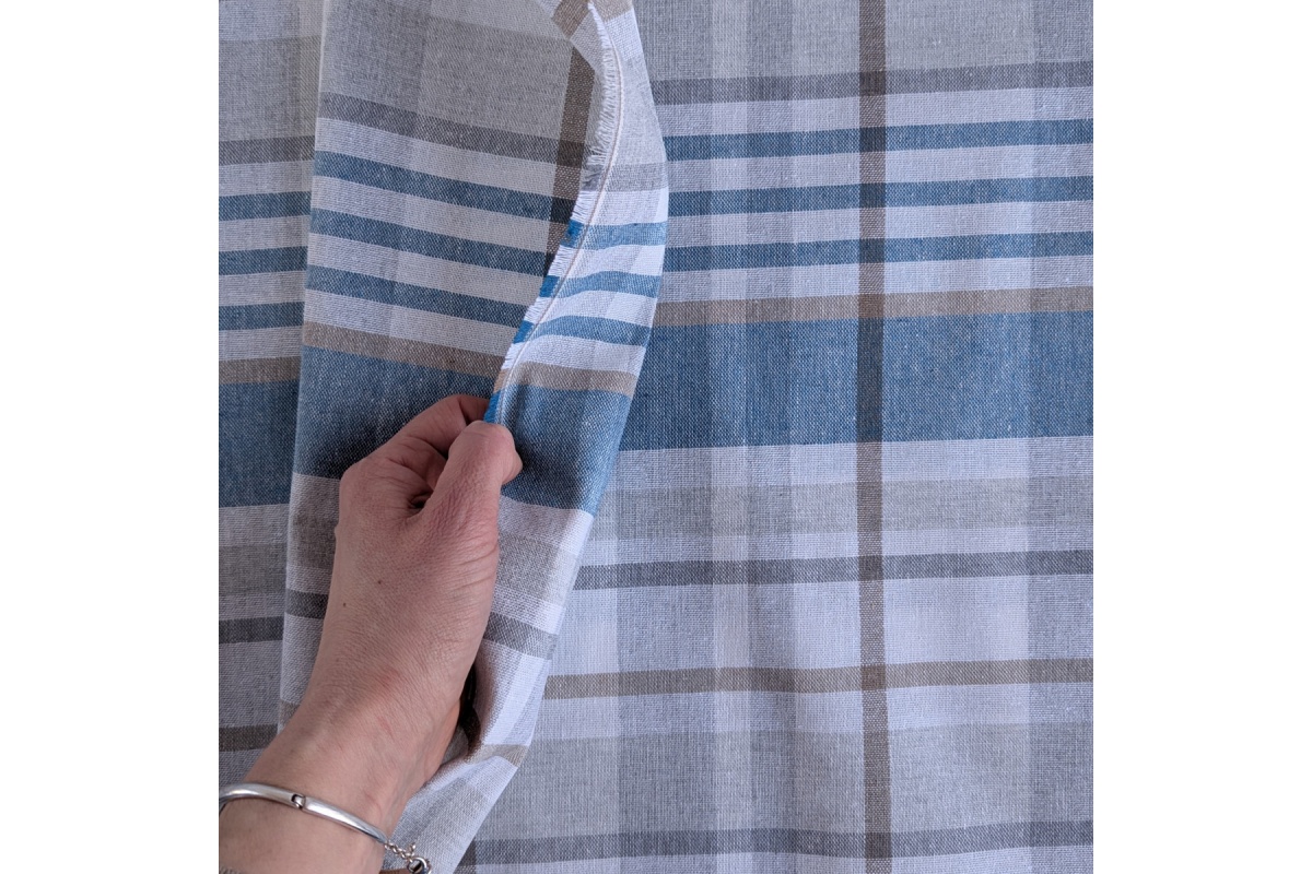 Tkanina dekoracyjna w kratę w kolorach beżu i turkusu.