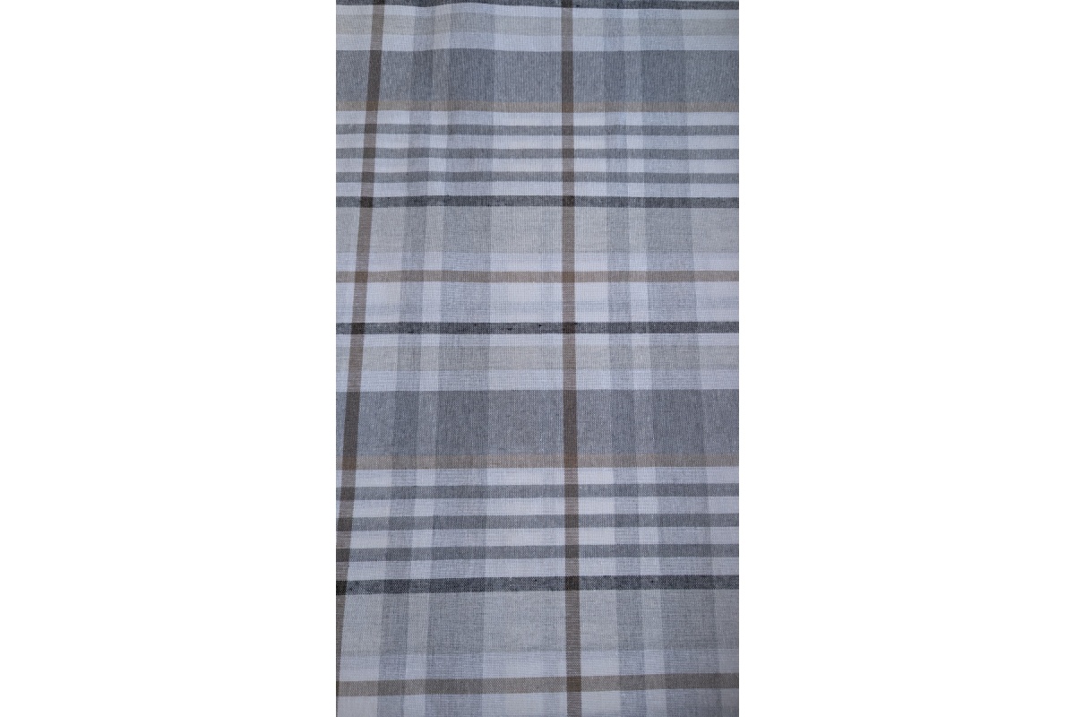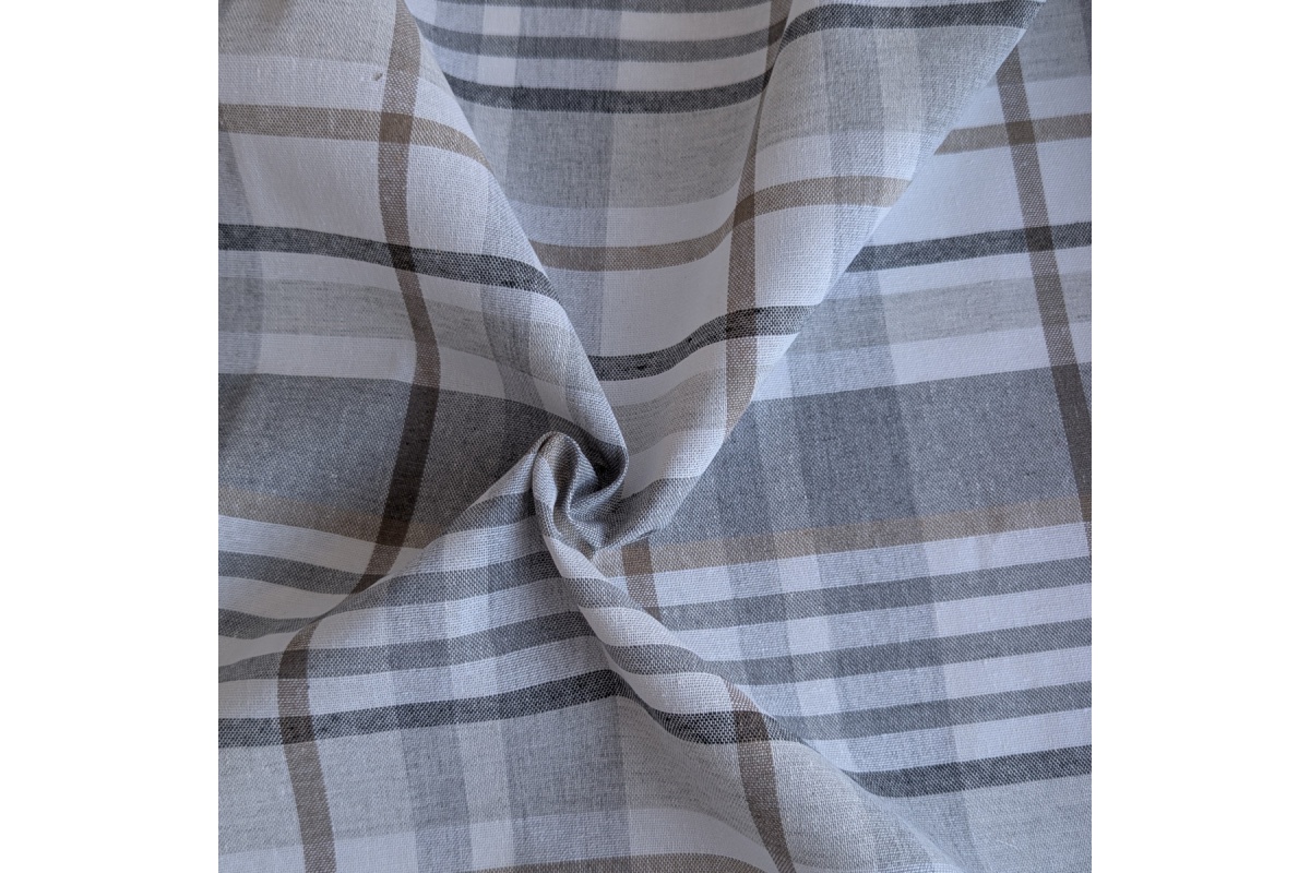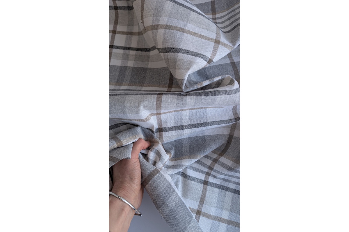 Tkanina dekoracyjna w kratę w kolorach beżu i szarości.
