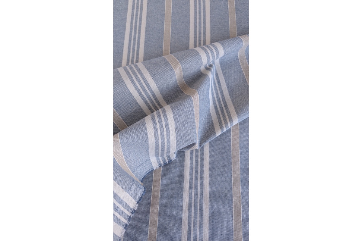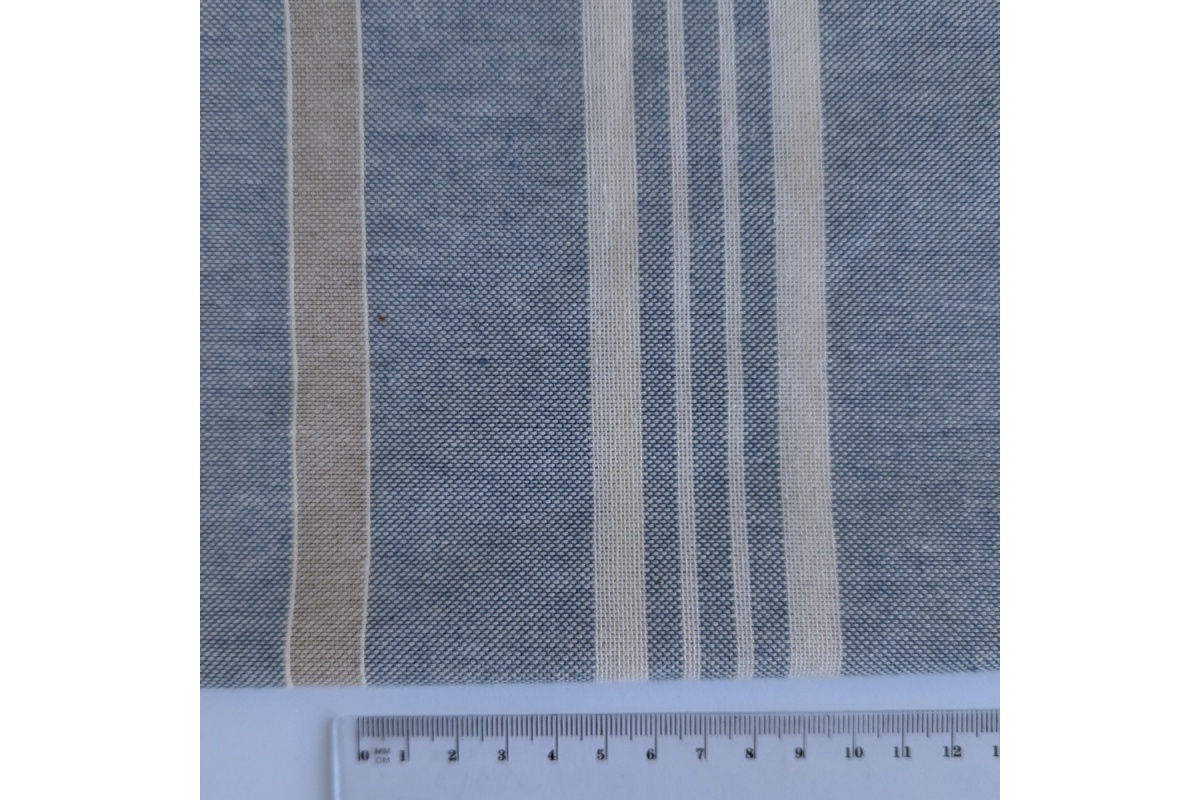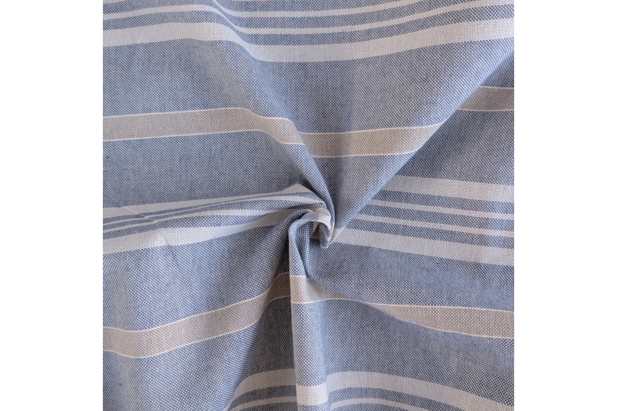 Tkanina dekoracyjna w pasy niebiesko-beżowe.