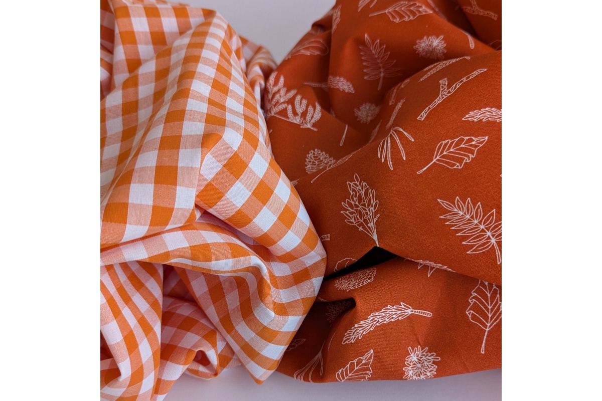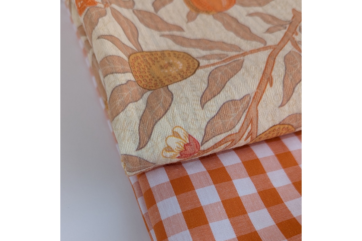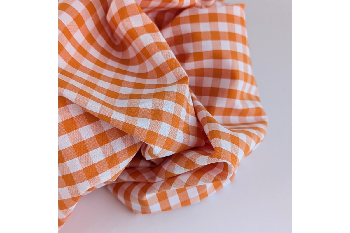 Tkanina bawełniana w kratkę o wielkości ok.10mm w kolorze pomarańczowym. Tkanina dwustronna.