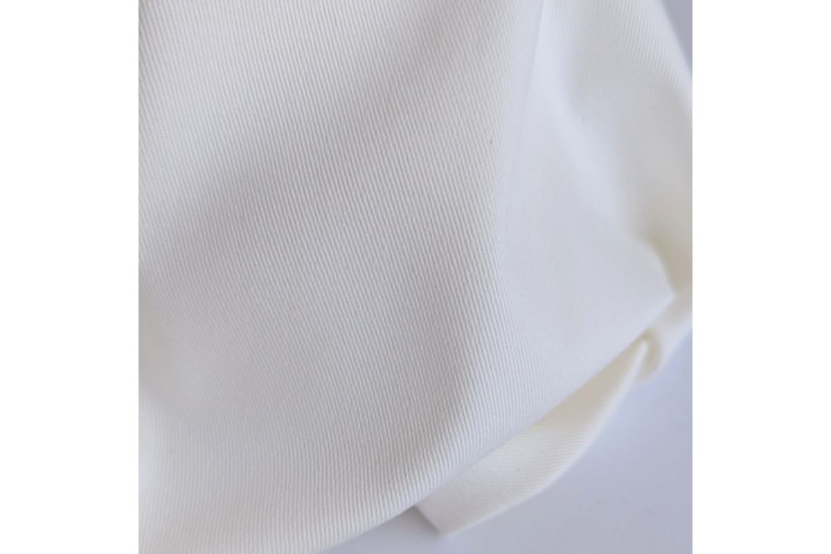 Elegancki bawełniany twill z dodatkiem elastanu w kolorze śmietankowym. Skośny splot z komfortem elastyczności. Tkanina jest wytrzymała, przyjemna w dotyku i doskonale dopasowuje się do sylwetki, co czyni ją idealnym wyborem do odzieży.