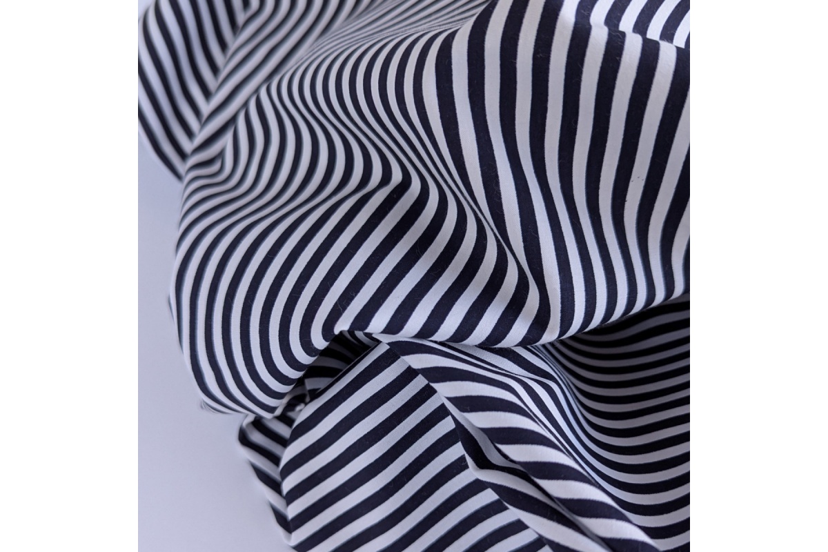 Tkanina bawełniana o splocie płóciennym w paski biało-granatowe o szerokości 4 mm. Lekka, przewiewna i delikatna tkanina.