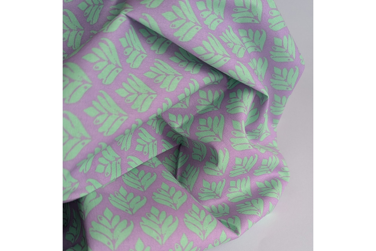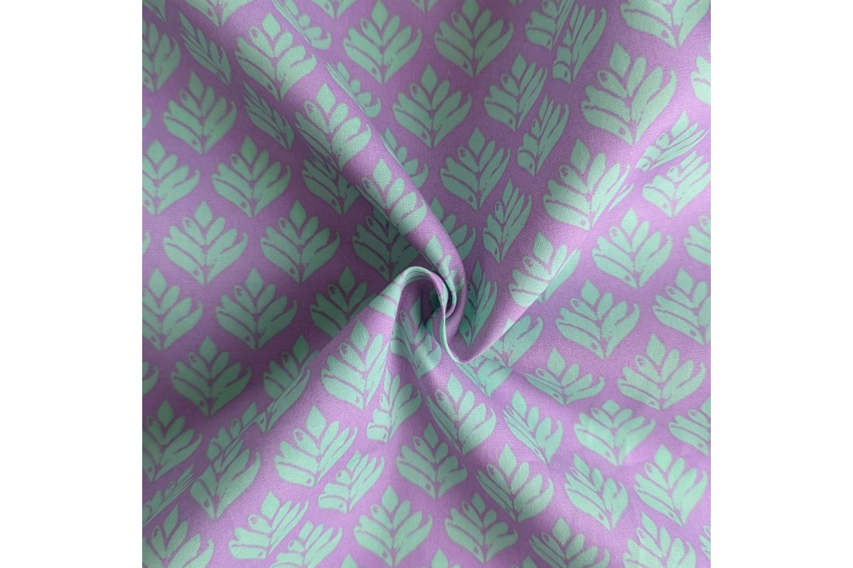 Tkanina bawełniana, popelina w miętowe listki na lawendowym tle.