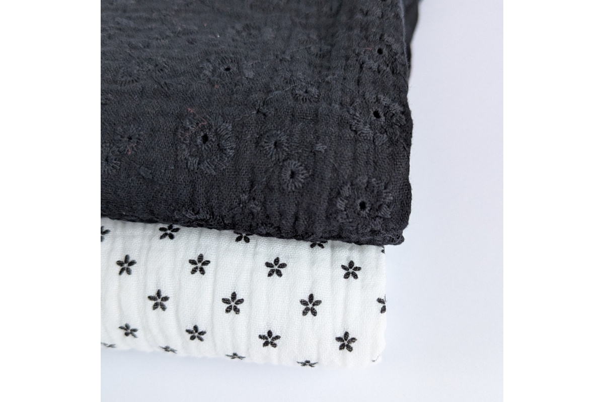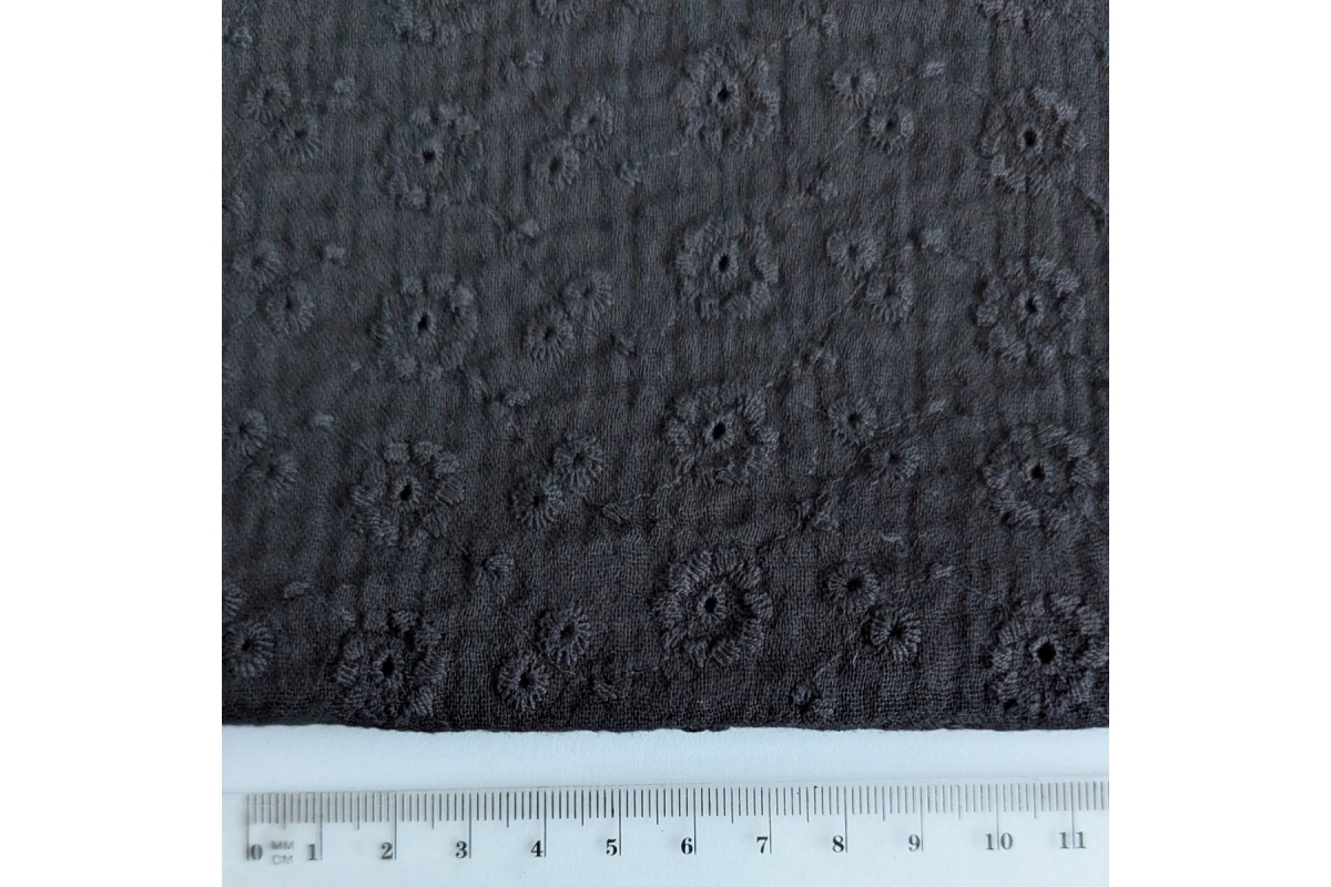 Wysokiej jakości miękka tkanina bawełniana - muślin z haftem kwiatowym, kolor czarny.
