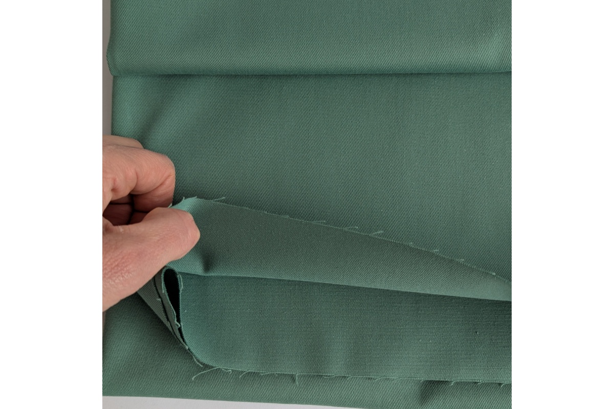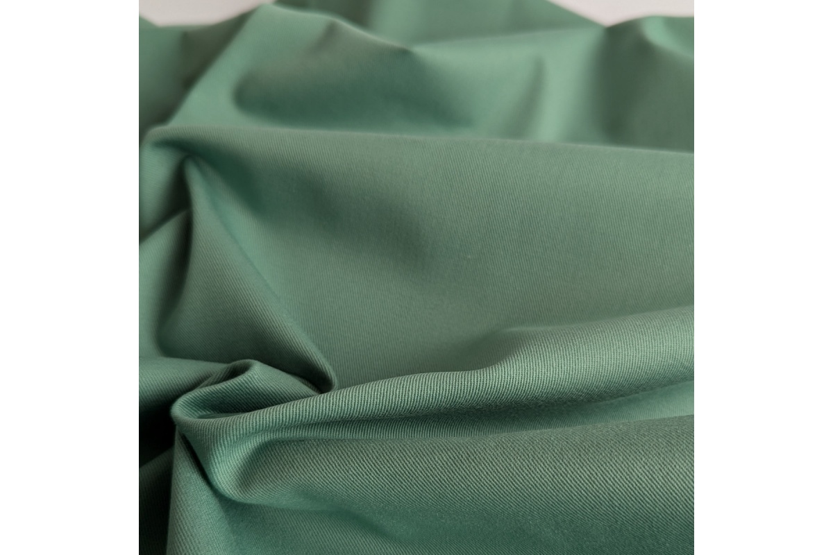 Elegancki bawełniany twill z dodatkiem elastanu w kolorze jadeitowym. Skośny splot z komfortem elastyczności. Tkanina jest wytrzymała, przyjemna w dotyku i doskonale dopasowuje się do sylwetki, co czyni ją idealnym wyborem do odzieży.