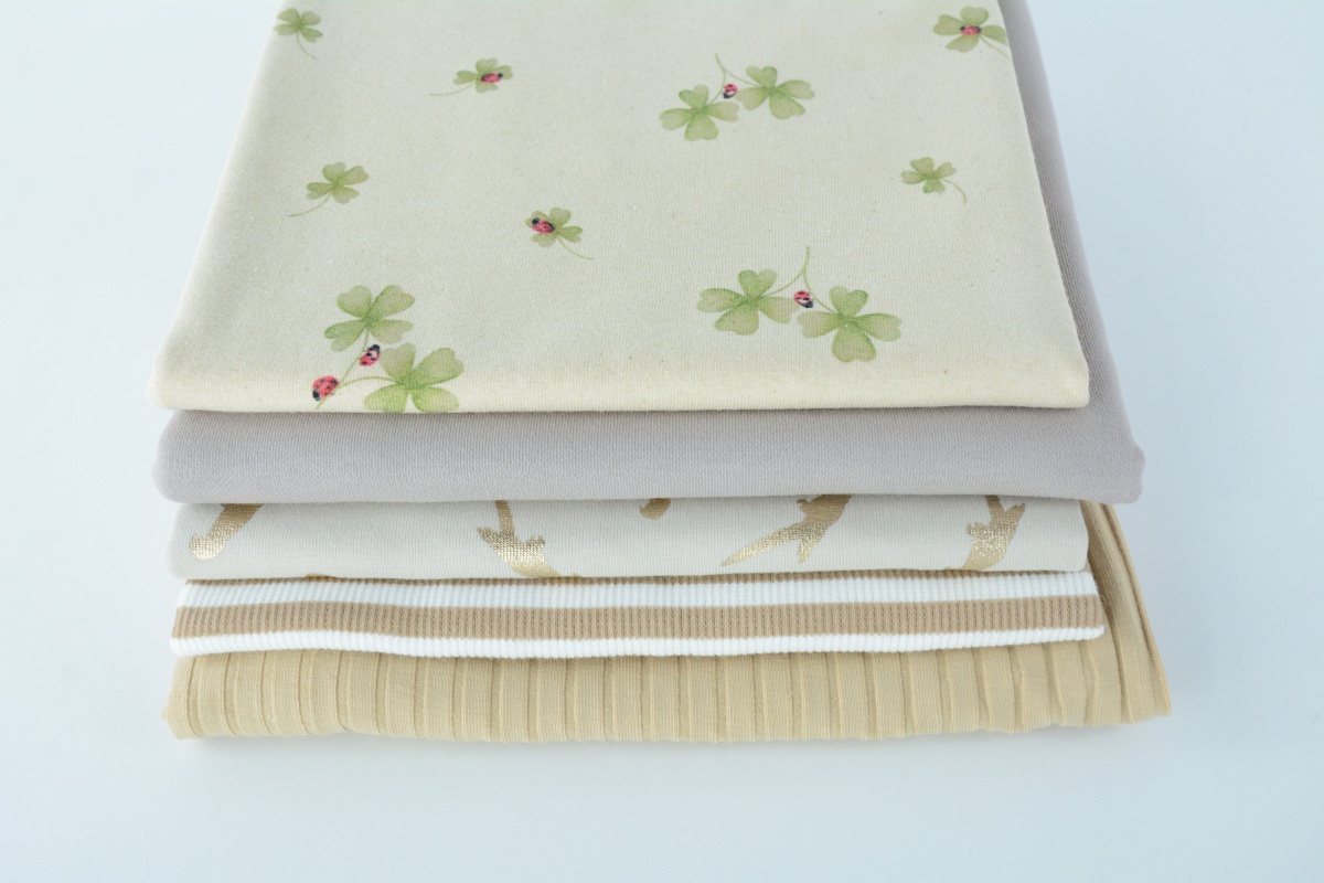 Zestaw 5 sztuk tkanin/dzianin widocznych na zdjęciu.